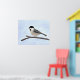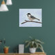 Poster impressão da minha ilustração de cor de água digital original de um Chickadee com prego preto empoleirado num galho sem folhas contra um céu azul pálido.