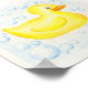Pato de borracha amarelo-branca cercado por bolhas, pronto para armação e pendurado na parede do banheiro.