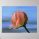 Um botão rosa de cor de pêssego, bonito, pintado, é a cevada aberta enquanto ela se aproxima do céu azul.