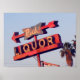 Um antigo sinal de neon para Rick Liquor em Los Angeles mostra uma seta em cores profundas vintage e destruiu azul contra palmeiras ao fundo.
