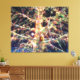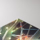 Uma árvore sem folhas com aspersão de neve espumante com luzes muito coloridas contra um céu escuro de inverno. Uma criatura pequena fez sua casa no porta-malas da árvore - há uma pequena porta vermelha com uma coroa de Natal sobre ela, e ao longo do porta-malas estão pequenas janelas redondas brilhando com a luz de fogo quente e luz de velas de dentro.