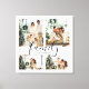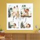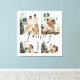 Uma tela de tela de colagem de fotos da família, moderna e única, de grande porte, é impressa para personalizar com 4 fotos favoritas. Memórias da família felizes, peça de decoração personalizada com a letra "família" do script de na moda.