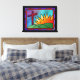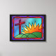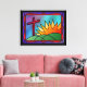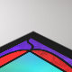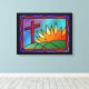 Um design de vidro manchado ilustrando a manhã da Páscoa, com uma cruz vermelha sobre colinas verdes ao lado de um nascer de sol feroz.