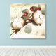 Tela quadrada para aprimorar sua decoração doméstica ou de escritório que retrata uma vista rústica, mas ainda elegante, de um pino de algodão com bagas vermelhas e folhas de eucalipto.