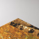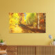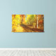 Um caminho supercrescido que percorre a floresta de pássaros em um dia ensolarado de outono. Os troncos preto e branco das árvores contrastam com folhas e gramíneas em todos os tons de ouro, de amarelo pálido a laranja profundo, iluminados pelos raios solares que passam pelos galhos.