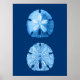 Impressão em uma ilustração da vida marinha vintage de um dólar de areia, digitalmente melhorado e colorido em tons de azul e branco, contra um fundo azul índio profundo