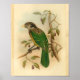 Ilustração vintage de 1888 de Pássaro Gato Verde Negra. Com penas verdes e amarelas sobre um galho de árvore.