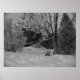 Esta linda fotografia de paisagem de inverno é uma poster incrível de um banco coberto de neve sentado entre as árvores. Belo impressão preto e branco para dar como presente ou pendurar no seu escritório.