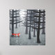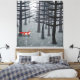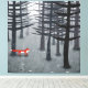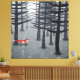 Uma raposa vermelha selvagem se situa entre as árvores de uma floresta escura. Uma pintura paisagística para amantes de animais, natureza e vida selvagem.