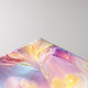 The image presents an abstract floral composition with a dreamlike quality. Large, stylized flowers in shades of purple, yellow, and pink dominate the foreground, their petals appearing translucent and glowing. The background is a swirling mix of blues, greens, and purples, creating a soft, ethereal atmosphere. Smaller floral elements with delicate stems reach upwards, adding depth to the scene.
