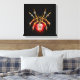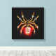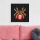 Aranha mecânica, com pá-pá de ouro, engrenagens de latão e uma lâmpada de vidro vermelha sobre fundo preto. Estilo Steampunk.