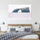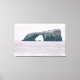Um grande arco natural de rocha fica majesticamente no meio de um oceano calmo. A arca é formada por uma rocha grande e escura de cinzas com uma abertura natural, criando um arco perfeito. A rocha é coberta de musgo e líquen verde-claro, acrescentando um toque de cor à paisagem da cinza. O céu é uma cinza pálida, sugerindo um dia nublado.