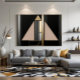Elevate your space with this sophisticated geometric art. Symmetrical shapes in deep black, metallic gold, and beige create an Art Deco-inspired composition. Precise lines and luxurious contrast bring balance and modernity. Ideal for premium branding, executive offices, and high-end interior decor.