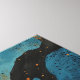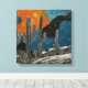 Este trabalho de arte representa uma paisagem desértica com cactos altos e pretos colocados contra um fundo vibrante e abstrato de lavagens a quente de cor laranja e legal azul. Os cactos são ilustrados no estilo do linocut, com linhas ousadas, escuras e textura detalhada, contrastando com as cores mais suaves e fluidas do céu. Os padrões circulares, tipo ondulação, no fundo sugerem um sol ou efeito de onda de calor, acrescentando ao cenário uma sensação intensa de calor e secura. Árvores deliciosas, sem folhas e terrenos desérticos rasgados completam a paisagem árida e esparsa.