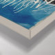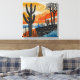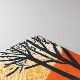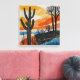 Este trabalho de arte representa uma paisagem desértica com cactos altos e pretos colocados contra um fundo vibrante e abstrato de lavagens a quente de cor laranja e legal azul. Os cactos são ilustrados no estilo do linocut, com linhas ousadas, escuras e textura detalhada, contrastando com as cores mais suaves e fluidas do céu. Os padrões circulares, tipo ondulação, no fundo sugerem um sol ou efeito de onda de calor, acrescentando ao cenário uma sensação intensa de calor e secura. Árvores deliciosas, sem folhas e terrenos desérticos rasgados completam a paisagem árida e esparsa.