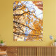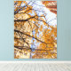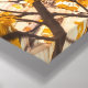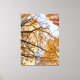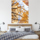 Um tiro de baixo ângulo captura edifícios altos parcialmente obscurecidos por uma vibrante cobertura de folhas amarelas do outono. Os ramos da árvore se estendem em direção ao céu, criando uma estrutura natural para o prédio. As folhas são uma matiz rica em ouro, contrastando com o céu azul claro a espreitar.