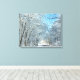 Belas árvores com neve agarrada aos galhos contra um céu azul brilhante.