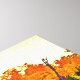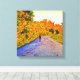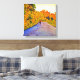 Uma mulher caminha por uma estrada alinhada com árvores em chamas com folhagem de outono.