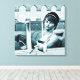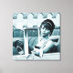 Renderização digital em 3D de uma bela jovem vintage sentada num carro no fundo de uma cidade de verão, coloração azul