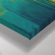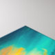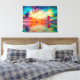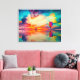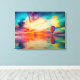 Uma imagem cênica colorida de um balão de ar quente voando no pôr do sol sobre a água.