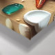 Beach home wall art décor. An impasto oil painting style ai illustration of a beach full of palm trees, sea glass, sea shells and ocean waves at sunset. A bright colorful mesh of colors make this coastal art vibrant and beautiful!