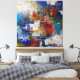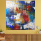 This abstract painting bursts with vibrant energy, blending deep blues, fiery reds, and warm yellows into a dynamic composition. Fluid spirals and geometric shapes intersect with bold brushstrokes, creating a sense of movement and emotional tension like a dance between chaos and calm, or “between silence and storm.”