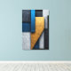 Abstract vertical composition with overlapping geometric panels. Deep blue tones, aged gold, and concrete gray with cracked texture. Modern and sophisticated design ideal for interior decor. Bring industrial elegance and visual depth to your wall with this exclusive art piece.
