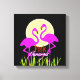 Tendência, fofo e muito sombrio, figura em canvas esticada com dois flamingos cor-de-rosa, percorrendo uma capa longa com uma grande ascensão solar no fundo.