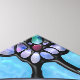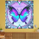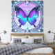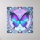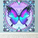 Uma borboleta vibrante com tons de azul e roxo é centrada dentro de um design circular ornamentado, cercada por intrincados padrões florais e joias decorativas. A composição total expele uma estética de vidro manchado com uma mistura harmoniosa de cores e simetria.