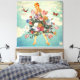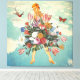 Modern Collage Wall Art. Esta é a vintage retro girl pinup girl com a aparência de uma grande buquê holandesa de flores contra um dramático céu nublado com beija-flores e borboleta. Cores de laranjas, pinças, amarelas, vermelhas, azuis e verdes. Divertido, mod e efemémia eclética. Esta é uma superfície plana com um acabamento de canvas liso. Arte divertida e surreal usando uma mistura de técnicas de colagem e arte digital, com uma sensação retrorreflectora vintage, do século médio.