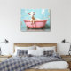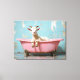 Uma pintura branca com uma cabra branca com chifres relaxando numa banheira rosa vintage, colocada contra uma parede azul clara para uma encantadora e divertida cena rústica.