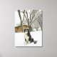 Impressão Em Tela Cachorro sentado à neve com cabana de madeira atrá