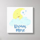 Encourage sweet dreams with this adorable and gentle "Dream More" illustration. Featuring a sleepy crescent moon and stars resting on a soft, fluffy cloud, this design is perfect for a nursery or a child's bedroom. It's a calm and comforting reminder to always let your dreams take flight.