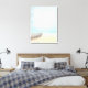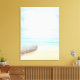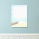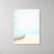 Impressão de tela com uma bela imagem rústica. Cores sutis de azul claro, marrom arenoso e branco suave. Uma cena de praia com um barco na praia com uma rede de pesca pendurada ao lado. Um olhar elegante.