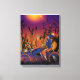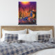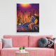 Duas pessoas andam de bicicleta ao redor de uma paisagem surreal no pôr do sol