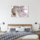 Uma fotografia de proximidade captura a delicada beleza de uma flor de cereja na flor do cheio. As pétalas brancas da flor são moles e translúcidas, com sutil pitada de rosa nas bordas. O centro da flor é um aglomerado de estames amarelos-ouros, cercado por um anel de filamentos brancos. O fundo é um borrão macio de rosas claro e branco, criando uma atmosfera sonhadora e etérea.