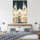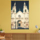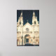 Uma fotografia captura a fachada imponente de uma grande igreja. O prédio tem duas torres altas e simétricas com detalhes intrincados, cada uma com um arame. Uma grande cruz fica sobre a parte central da igreja, enquanto uma janela circular de vidro manchado agita a frente. A entrada é enquadrada por uma série de arcos e colunas, levando a um conjunto de etapas.