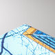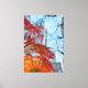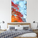 A imagem captura uma vibrante cena de paisagem urbana durante o outono. Um arranha-céu alto e moderno, com janelas de cor azul, sobe ao fundo, parcialmente obscurecido por uma árvore mapeadora com folhas vermelhas e laranja brilhantes no primeiro plano. Ramais de árvore nu chegam em direção ao céu azul claro. A parte inferior da imagem revela um prédio com detalhes arquitetônicos clássicos.