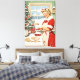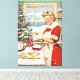 Numa cozinha confortável e coberta de neve, a Sra. Claus é capturada no meio de assar de férias. Vestida com um vestido vermelho festivo com capas aparadas de pele, e um avental correspondente, ela sorri muito bem enquanto prepara um novo lote de biscoitos. A cena é cheia de alegria natalícia, completa com uma árvore maravilhosamente decorada, enfeitada com canas doces e ornamentos vermelhos, enquanto a neve suavemente cai fora da janela, adicionando à atmosfera mágica da estação.