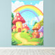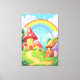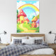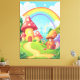 Cogumelos bonitos com chapéus vermelhos, castanhos e azuis com manchas brancas. Um céu azul com arco-íris. Belo toque na parede de um quarto infantil.