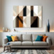 Esta obra abstrata combina formas geométricas em tons terrosos e neutros, criando um equilíbrio harmonioso entre estrutura e suavidade. As interseções de triângulos e retângulos sugerem movimento e profundidade, convidando à contemplação serena da ordem visual num jogo de luz e sombra.