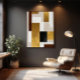 Composição geométrica de cubos ouros e castanhos que se cruzam perfeitamente. A arte minimalista e elegante reflete riqueza e sofisticação, fazer-a uma peça de arte perfeita para ambientes modernos.