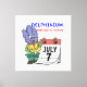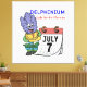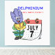 Imagem cartoonista da Flor Delfinium com exibição de julho, 7 mês no calendário. Em julho, torcendo com flores azuis vibrantes, o delfinium pastou jardins, acrescentando um toque de elegância e se tornando a flor de nascimento para aqueles que têm a sorte de compartilhar o sol de verão.