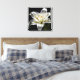 A pristine white lily, its petals delicately dusted with sparkling crystals, set against a black background.