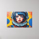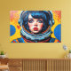 A obra de arte digital de Otis Porritt apresenta um impressionante close-up de uma mulher em um capacete de astronauta, renderizado com uma estética dinâmica de Pop Art. Seus olhos azuis penetrantes e lábios vermelhos vibrantes chamam a atenção, enquanto seu rosto é adornado com um padrão de pontos Ben-Day vermelhos, imitando a impressão de quadrinhos. Contornos pretos ousados definem suas feições e os contornos do capacete amarelo e branco. O fundo, um azul vibrante pontuado por explosões gráficas e pontos de meio-tom, amplifica o clima enérgico e retro-futurista deste retrato cativante.