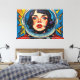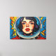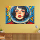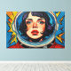A obra de arte digital de Otis Porritt apresenta um impressionante close-up do rosto de uma mulher, enquadrado dentro do visor reflexivo do capacete de um astronauta. Seus intensos olhos azuis, adornados com cílios longos, e sardas delicadas atraem o espectador, contrastados por lábios vermelhos vibrantes. A peça é renderizada com pinceladas ousadas e expressivas que imitam uma textura rica de impasto, criando uma superfície visual dinâmica. Uma paleta vívida de azuis profundos, amarelos brilhantes e vermelhos flamejantes domina, com um padrão lúdico de bolinhas animando o fundo, realçando a presença enérgica e cativante da obra.