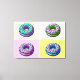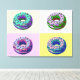 A retro style pop art of four colorful frosted donuts with sprinkles in vivid colors on pastel backgrounds for foodies. Makes a perfect kitchen wall decoration.