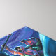 Dragon Rider art é uma pintura de fantasia dramática de Traci Van Wagoner apresentando um dragão verde azul em uma dramática pose voadora com um cavaleiro feiticeiro segurando um funcionarios alto nas costas com um cavaleiro-criança atrás. Qualquer um que ama dragões e arte de fantasia amará esta trabalho de arte.