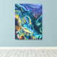 Dragon Rider art é uma pintura de fantasia dramática de Traci Van Wagoner apresentando um dragão verde azul em uma dramática pose voadora com um cavaleiro vermelho segurando um funcionarios alto nas costas com um cavaleiro-criança atrás. Qualquer um que ama dragões e arte de fantasia amará esta trabalho de arte.