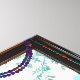 Boho wall art. A rustic wood window with a white, orange and purple feathered dreamcatcher hanging in the window along with a string of colorful crystals. The window overlooks a beautiful scene of forest and mountains.